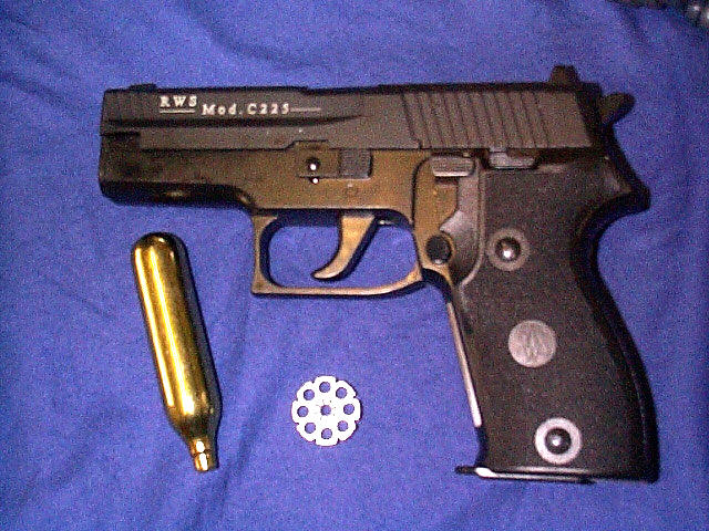 shot repeater air pistol. Uses standard CO2 gas cartridges.