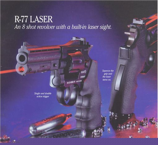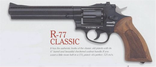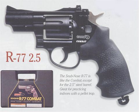 The Snub-Nose R-77 is like the Combat, except for the 2.594 steel barrel. Great for practicing indoors with a pellet trap.